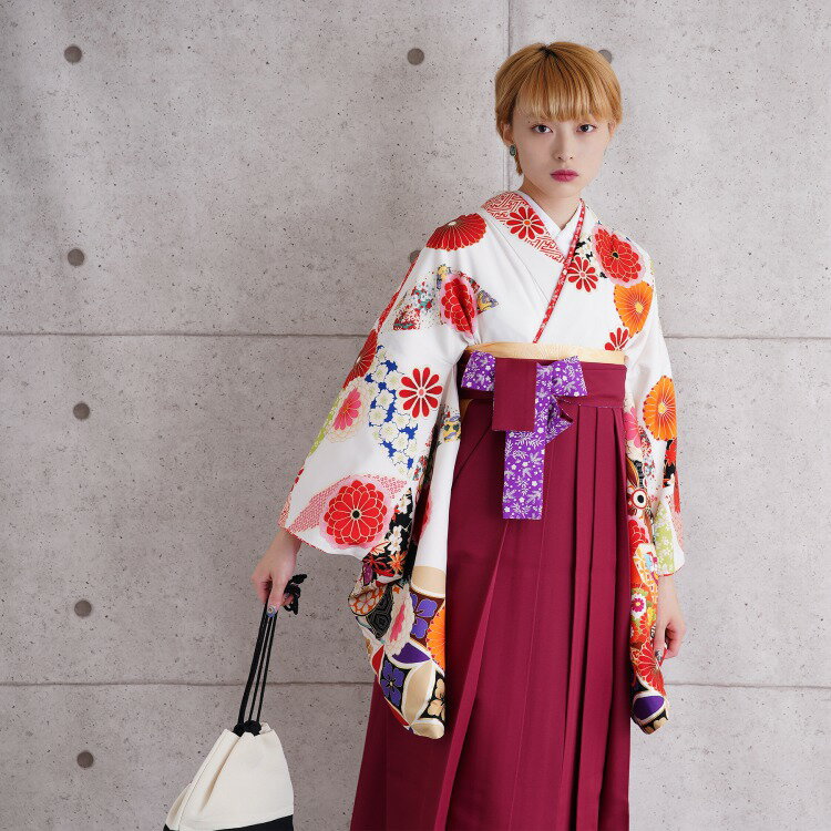 【レンタル】ひよこ商店 往復送料無料 2尺袖 着物 袴 16点セット 袴91cm(身長153-158cm) 袴セット 国内染色 国産生地 卒業式 大学生 専門学生 花柄 女性 白女性 ladies きなり ベージュ えんじ 赤茶 フラワー 菊 ニュアンス くすみカラー モダン