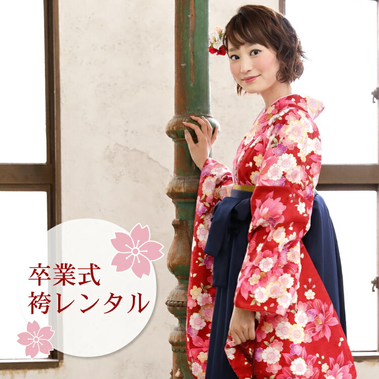 【最大1000円OFFクーポン】【レンタル】 卒業式 袴 レンタル 女 袴セット 女性 卒業式袴セット2尺袖着物&袴 フルセットレンタル 安い 「赤地に金の縁取りぼかしピンク・白の桜」〔消費税込み〕