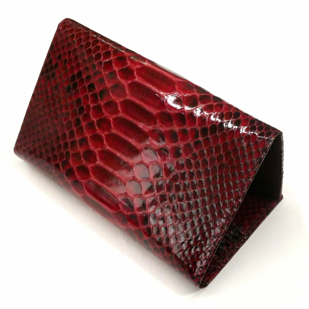 三つ折り財布 長財布 マチなし 薄型 ファスナー収納 パスポート 本革 ヘビ革 蛇革 パイソン革 グレージング レッド