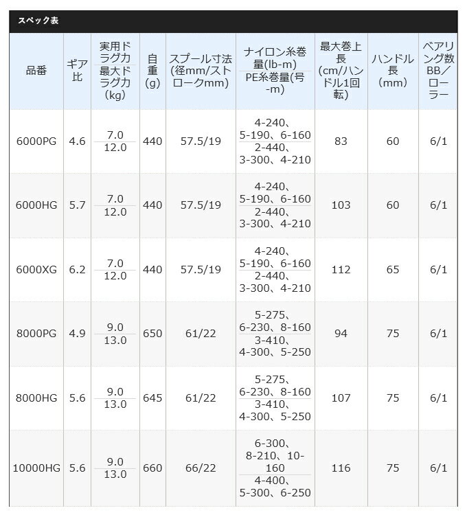●品番:10000HG●ギア比:5.6●実用ドラグ:9.0●最大ドラグ力(kg):13.0●自重(g):660●スプール寸法(径mm/ストロークmm):66/22●ナイロン糸巻量(号-m):6-300、8-210、10-160●PE糸巻量(号-m):4-400、5-300、6-250●最大巻上長(cm/ハンドル1回転):116●ハンドル長(mm):75●ベアリング数:6/1------------------------/ソルトウォーター/ソルトルアー/ショアジギング/ショアライトジギング/オフショア/ジギング/ロックショア/プラッキング/シーバス/