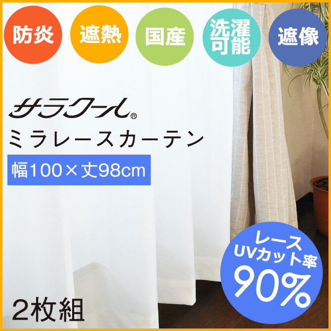 ミラーレースカーテン UVカット率90%以上 サラクール 幅100×98cm・2枚組【日本製】 ミラーカーテン 昼も夜も見えにくい 防炎カーテン 遮熱カーテン 遮熱レースカーテン 国産 ウォッシャブル 遮像 1.5倍ヒダの高品質レースカーテン! 省エネ対策 節電 エコカーテン